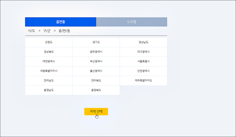 이후 '읍면동으로 선택' 버튼을 클릭하면, 더욱 세부적인 지역을 선택할 수 있습니다.