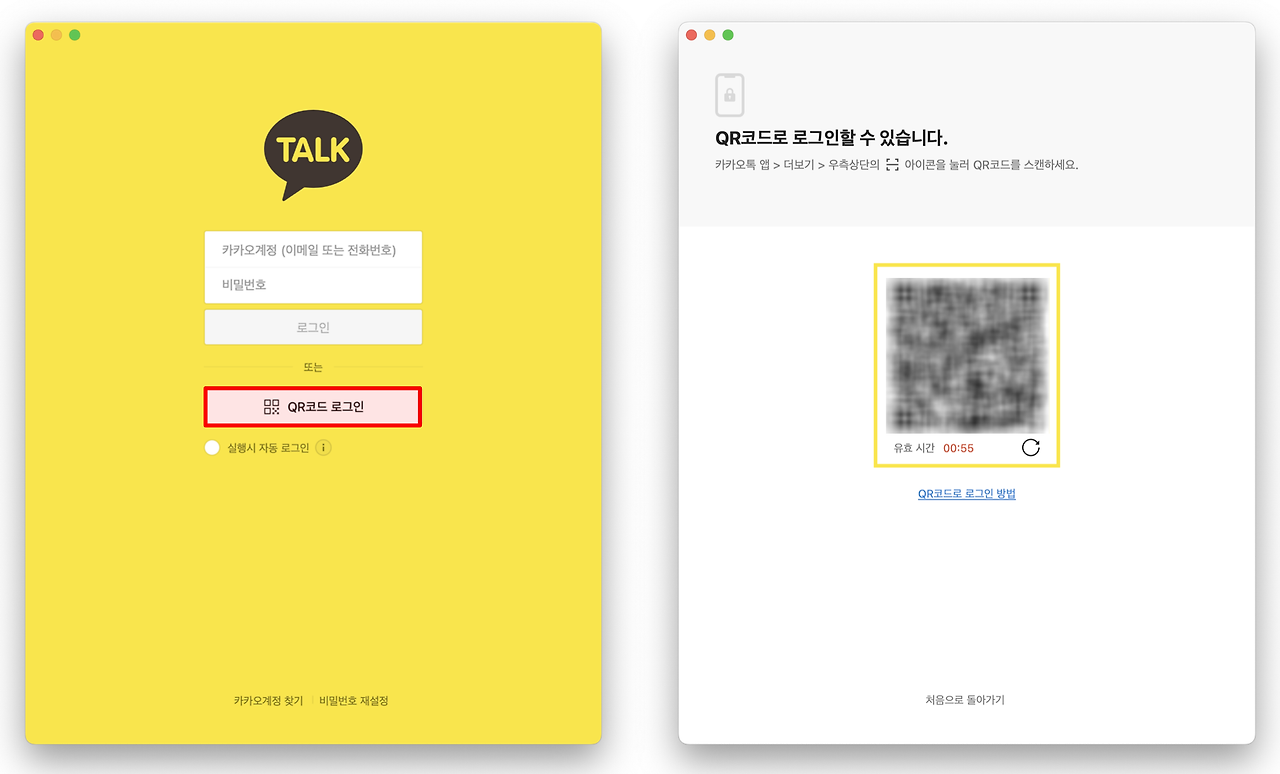 - 설치 완료 후, 카카오톡을 실행하여 로그인합니다. 이미 가입된 계정으로 로그인하면 됩니다.