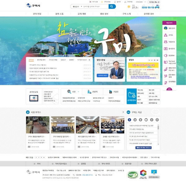 구미시청 홈페이지는 다양한 정보를 제공하는 플랫폼으로, 주요 메뉴에는 행정 알림, 시민 서비스, 구미 소개 등이 포함되어 있습니다.