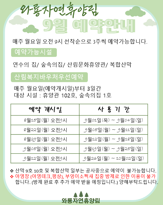 - 각 자연휴양림마다 규정이 다를 수 있으니, 사전에 해당 휴양림의 이용 규정을 확인하는 것이 중요합니다. 특히, 쓰레기 처리 및 소음 문제에 유의해야 합니다.