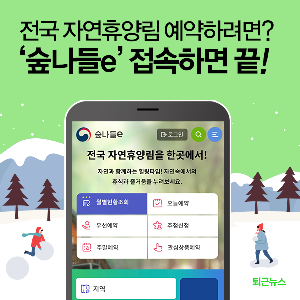 이번 주말에는 숲나들e를 통해 자연 속에서 힐링의 시간을 가져보시기 바랍니다.