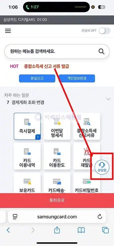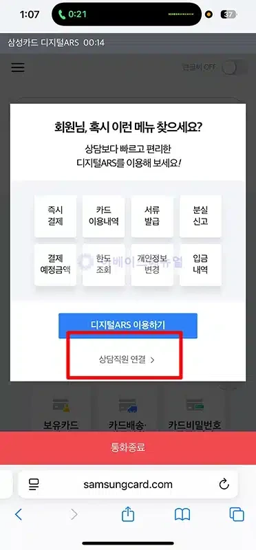 - 상담원 연결 메뉴 : ARS 음성 안내에 따라 상담원 연결 메뉴를 선택해야 합니다.