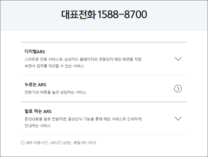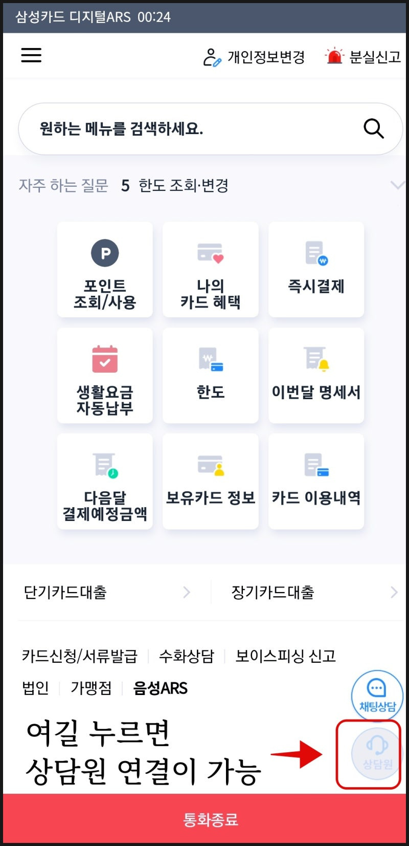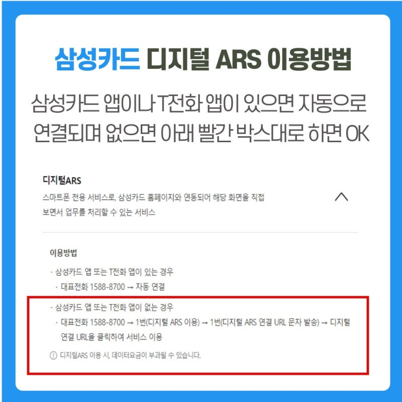 - 디지털 ARS 이용 : 삼성카드 앱이나 T전화 앱이 있는 경우, 대표전화로 자동 연결됩니다.