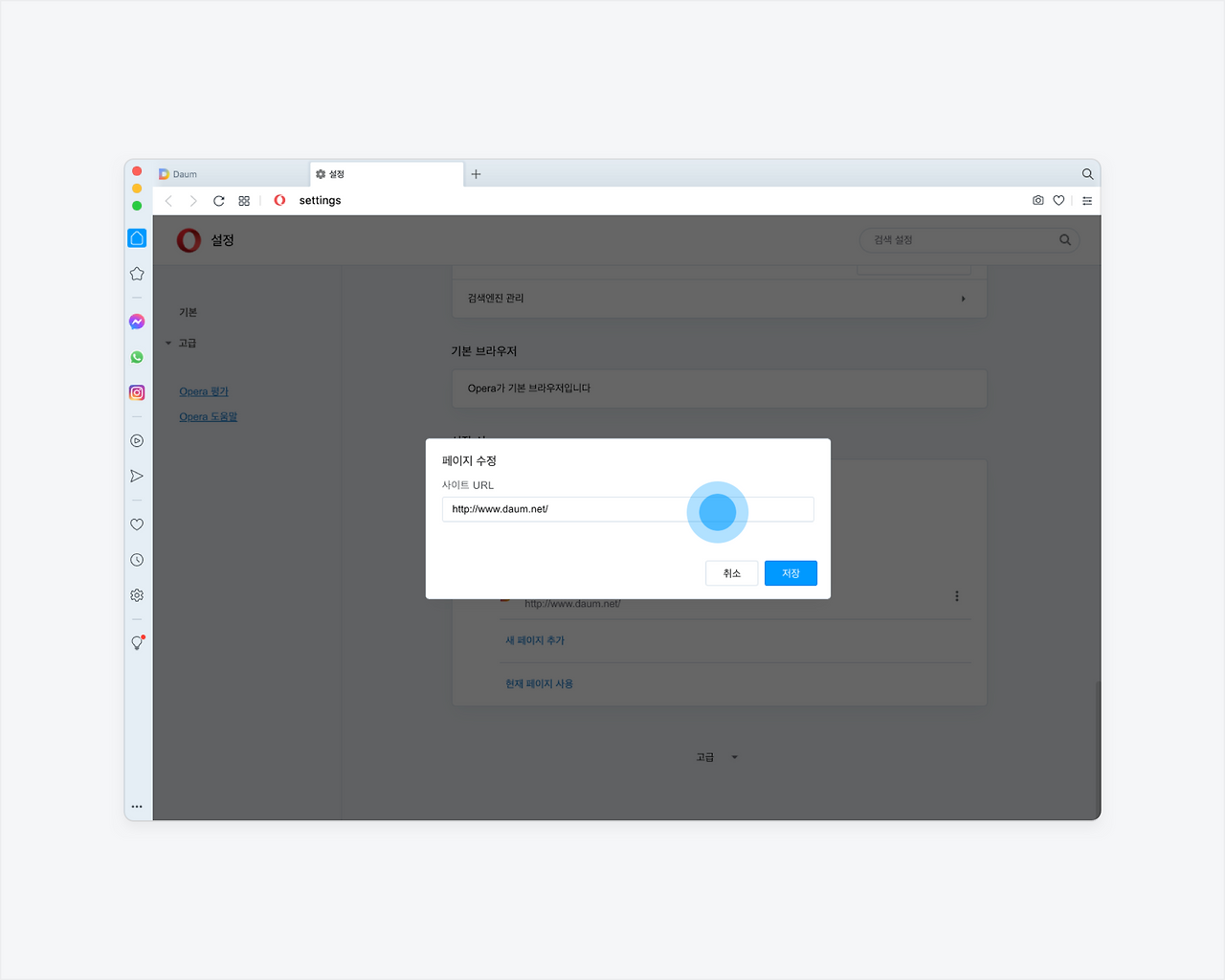 - '새 페이지 추가'를 클릭하고, https://www.daum.net을 입력한 후 '추가'를 클릭합니다.
