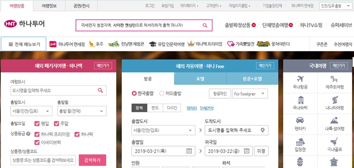홈페이지에 접속하면 메인 화면에서 원하는 여행 상품을 검색할 수 있는 검색창이 보입니다.