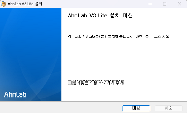 사용자가 원하는 옵션을 선택하고, 약관에 동의한 뒤 설치를 완료하면 V3 Lite가 PC에 설치됩니다.