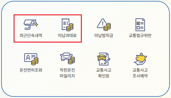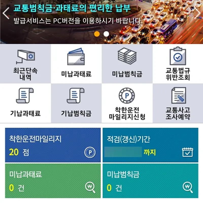 - 조회 메뉴 선택 : 로그인 후, '교통범칙금 조회' 또는 '법규 위반 조회' 메뉴를 선택합니다.