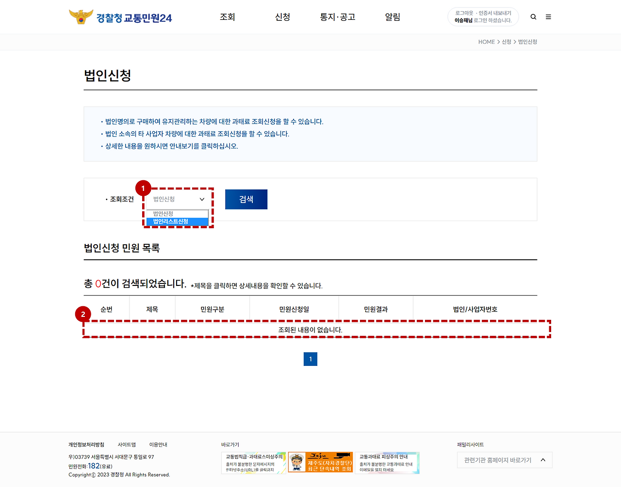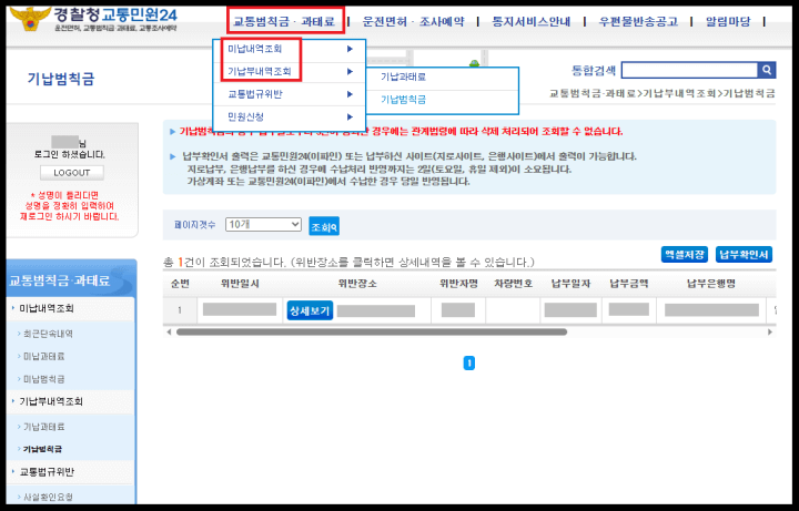 - 조회 결과 확인 : 입력한 정보에 따라 조회된 범칙금 내역을 확인할 수 있습니다.