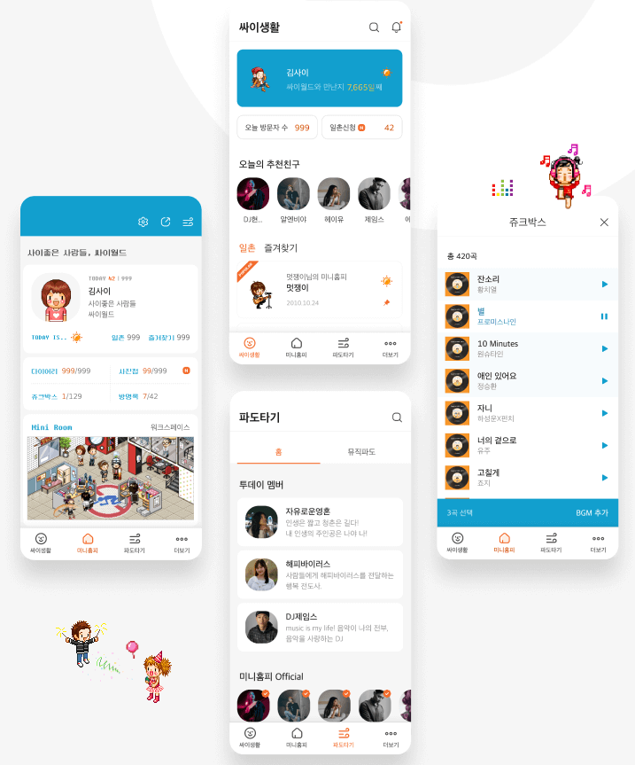 미니홈피에는 사진첩, 방명록, 음악 플레이어 등 다양한 요소가 있어 사용자들이 자신의 개성을 표현할 수 있었습니다.